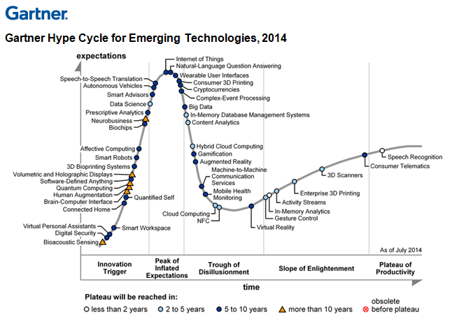 Machine-to-Machine (M2M) has been around since ~1970, and the fundamental concept of networking computers over distance has existed since the birth of the internet itself. Every new technology is a combination of the technologies before it, and nothing exists in a vacuum. So to discuss the history of IoT, we need to choose a somewhat arbitrary date. The term IoT was coined in 1999, but let’s start in 2014 when IoT was at the peak of the hype cycle.